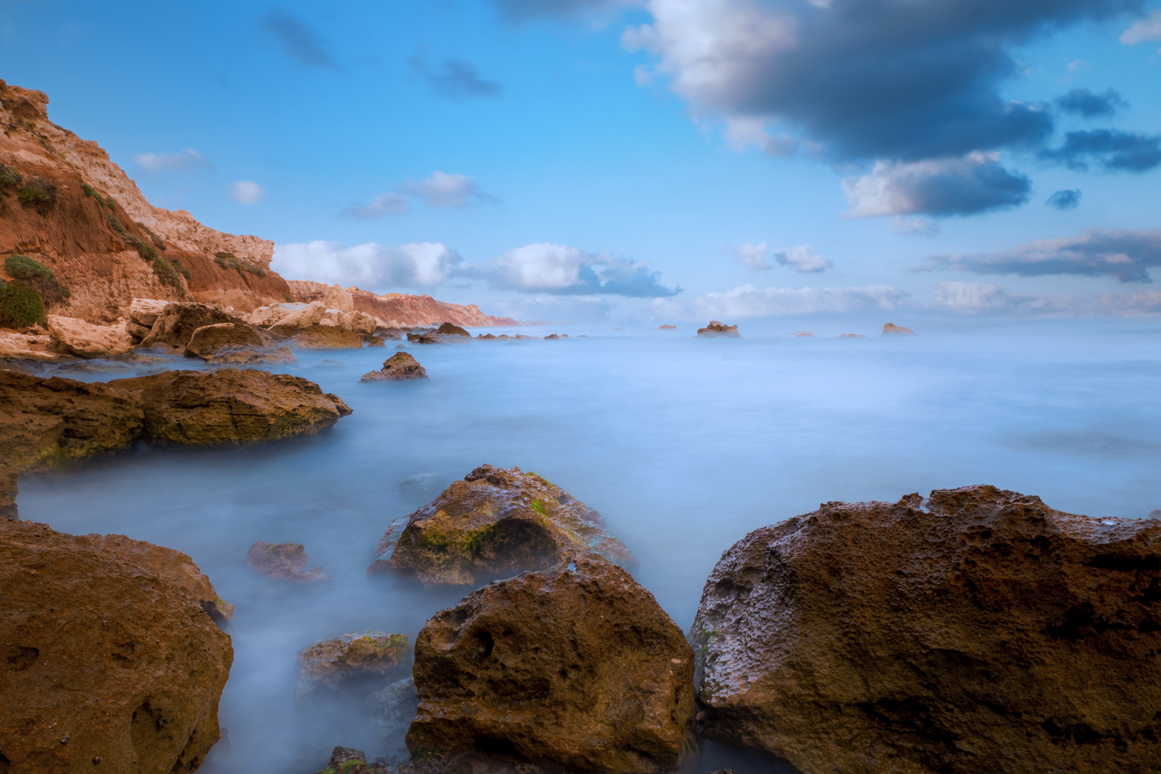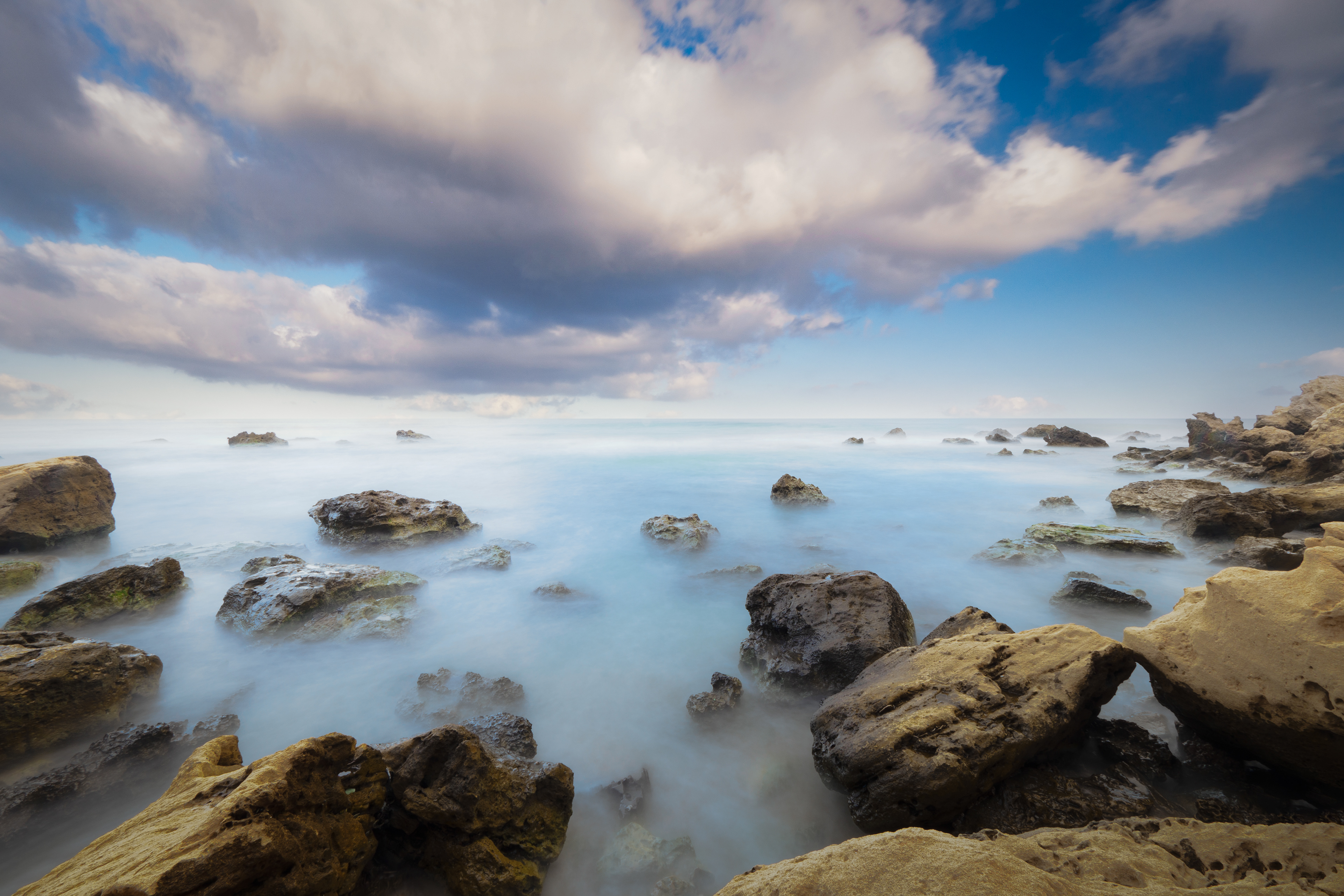 “⛅️ Sunrise light on the sea: Clouds are beginning to scatter. No one is here except of couple of surfers and passing by beach runners. The air is clean and you can see all the way to the horizon. Calmness and tranquility in the beginning of the day.